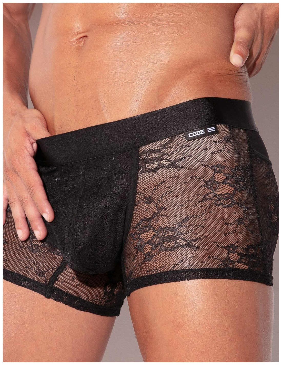 Black semi-transparent trunks in lace and mesh from CODE 22 in a low-rise style.